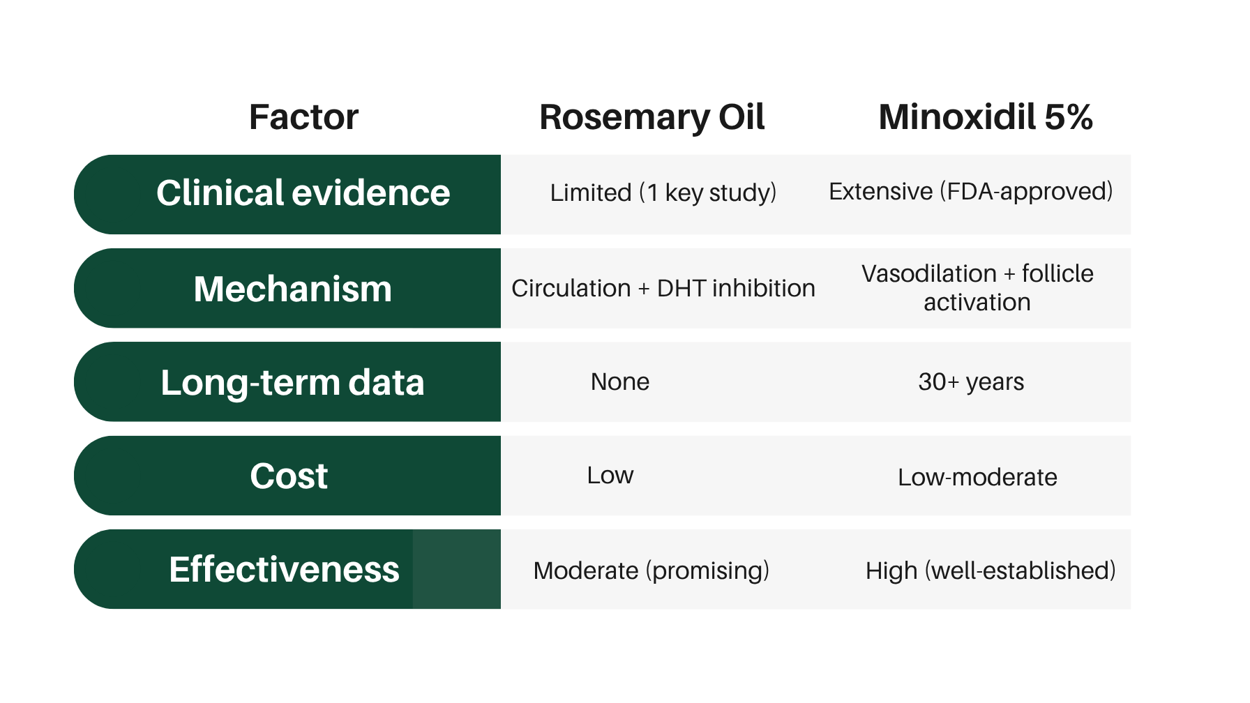 No long-term data exists. Minoxidil has decades of clinical evidence, FDA approval, and long-term efficacy data. Rosemary oil has one notable study and anecdotal reports.